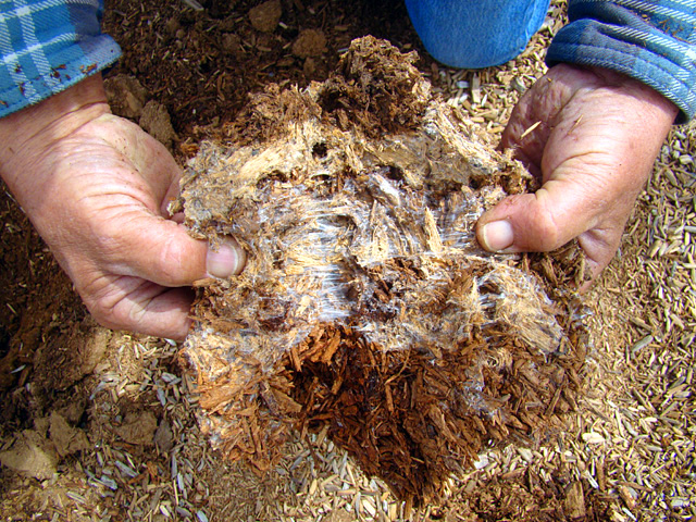 When fungus grows and effectively binds together wood chips or EWF (Engineered Wood Fiber), the fungal strands can be very strong and fibrous.